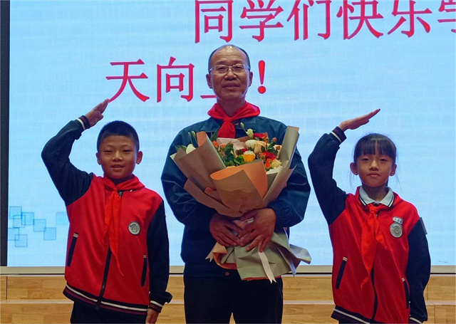 在課堂結束后的采訪環節中,同學們踴躍提問,趙奇生回答了同學們的問題并且鼓勵同學們“學習如逆水行舟,不進則退,要不斷學習,不斷進步。”活動最后,學生代表為趙奇生戴上紅領巾并向他獻花。