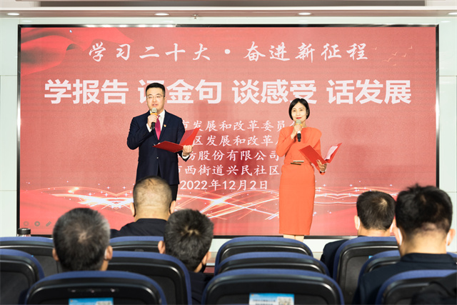 為持續(xù)深入學習領會、全面準確把握黨的二十大精神,12月2日,濱州市發(fā)展改革委聯(lián)合濱城區(qū)發(fā)展和改革局、華紡股份有限公司、市西街道興民社區(qū)舉辦“學習二十大·奮進新征程·學報告、誦金句、談感受、話發(fā)展”活動。團市委副書記丁寶冬、華紡股份有限公司黨委委員、人力行政總監(jiān)孫玉濤出席活動。市發(fā)展改革委、濱城區(qū)發(fā)展和改革局、華紡股份有限公司、興民社區(qū)黨員代表參加活動。